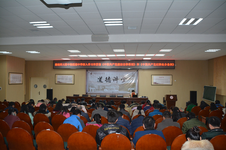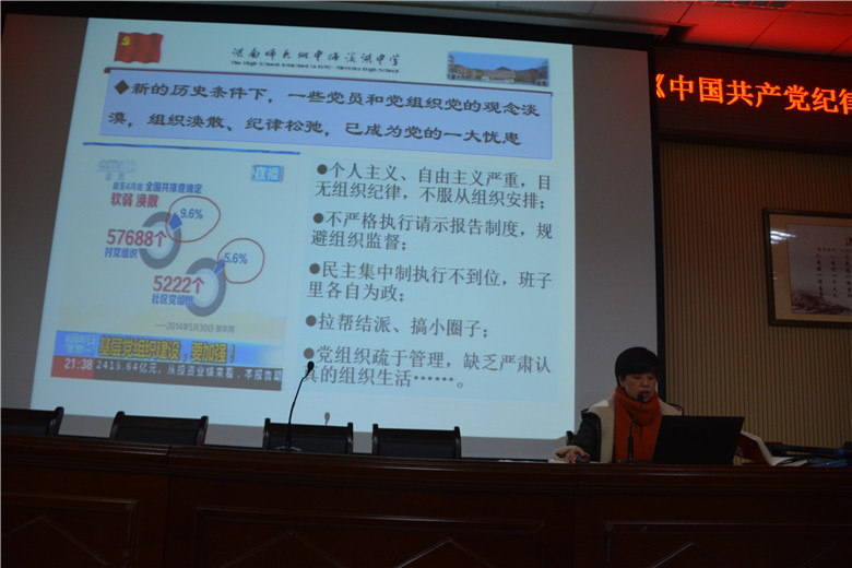 17日下午,我校在教学楼三楼阶梯教室召开“讲诚信、守纪律、懂规矩、做表率”党员大会,深入学习和贯彻《中国共产党廉洁自律准则》及《中国共产党纪律处分条例》,校党总支书记钟慧莉主持会议并讲话。全校党员教师参会。