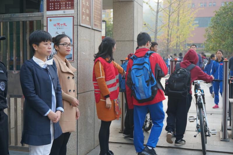 11月9日早上7:00,党支部书记钟惠莉和七年级年级组长王光裕带领20多名党员及志愿者教师、10多名学生志愿者于学校大门集合,大家身穿师梅义工服装,佩戴党徽,热情投入到活动中。活动分三组开展:一组由七年级党支部书记胡正凯带领,负责规范学生仪容仪表,维持学生入校的有序化;一组由七年级1707班班主任蒋希带领,负责规范校门口共享单车的有序摆放;一组由七年级数学备课组组长贺川芝带领负责组织疏通校门口车辆。党员及志愿者师生以实际行动在学校主要道路交通路口和交通高峰时段为全体师生的安全、文明出行贡献一份力量。