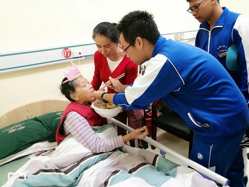10月16日,也是一位老奶奶八十大寿的日子,同学们为老奶奶庆生并喂老奶奶吃寿面。老人们都很乐观,容颜的老去并不能使他们的心上生出皱纹。最后,同学们送上了最真挚的祝福。这次活动取得了圆满的成功。
