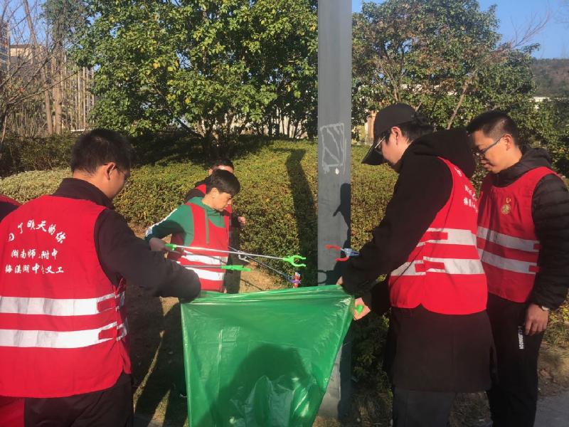 11月19日下午,高二年级党支部在联点领导、党委书记钟慧莉,年级组长方煦,支部书记刘女兢的组织带领下到桃花岭捡拾垃圾、清理水面垃圾。