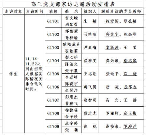本次家访活动高三年级党支部提前部署,做了具体要求,根据实际情况,确定了各班走访学生的名单以及走访方案。由于高三工作任务重,各班老师们只能利用周末或者晚上的时间赴学生家进行走访。
