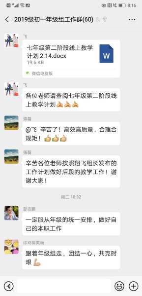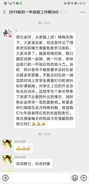在正式开学前,为了保障同学们在超长假期中学有所成,在年级组长宋翔飞的组织领导下,七年级全体教师按照市教育局要求进行“停课不停学”活动,两周内给家长和学生推送了三封信,录制了20节线上课程,提供了40份学习资料。由语文组梁月老师执笔给学生写了题为《做好自己,守望曙色》的一封信,信中首先提到了为战“疫”做出贡献的各行各业人士,激励学生热爱祖国,学好知识报效祖国。同时将七年级全体老师的嘱托带给学生们。希望他们在家能坚持锻炼,合理规划时间,自主学习,养成良好的自律品质。最后期待早日与同学们在美丽的师梅校园里重逢。