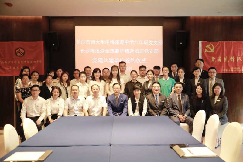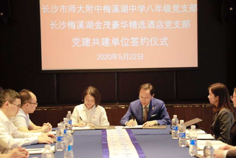 为了进一步响应“大党建”理念,加强基层党组织交流合作。5月22日上午,我校八年级党支部与金茂梅溪湖豪华精选酒店党支部党建共建及廉洁伙伴协议的签约仪式在金茂梅溪湖豪华精选酒店董事会会议室隆重举行。我校党委书记钟慧莉书记、副校长胡惠、八年级支部委员与学校党员代表,金茂梅溪湖豪华精选酒店党支部全体成员参加了此次活动。