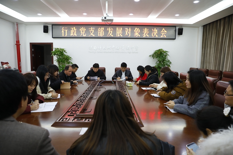 12月14日,行政党支部召开会议,对是否接收发展对象唐智明成为预备党员进行表决。会议由党支部书记胡海军主持。联点领导、校办主任兼保卫处、外事办主任胡田超出席会议。18名行政支部党员和列席代表曹稳参加会议。