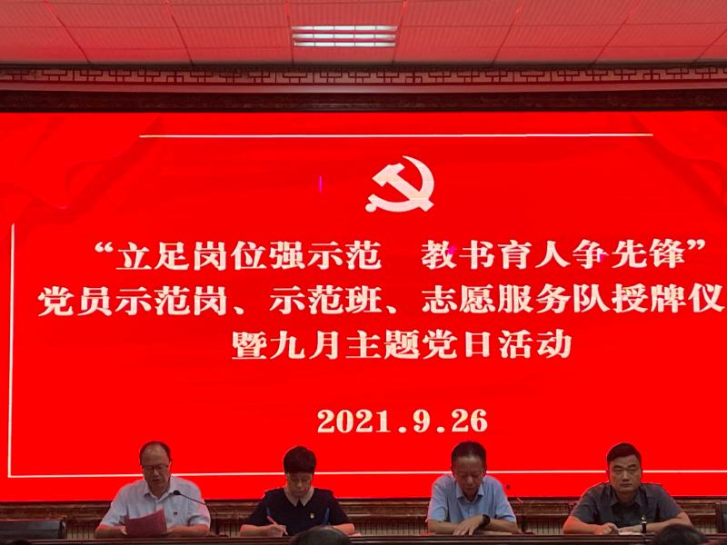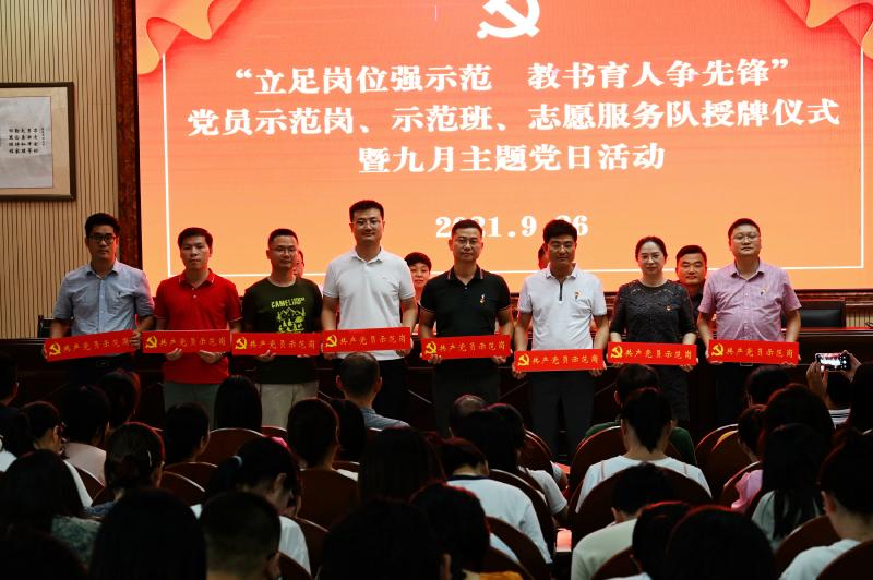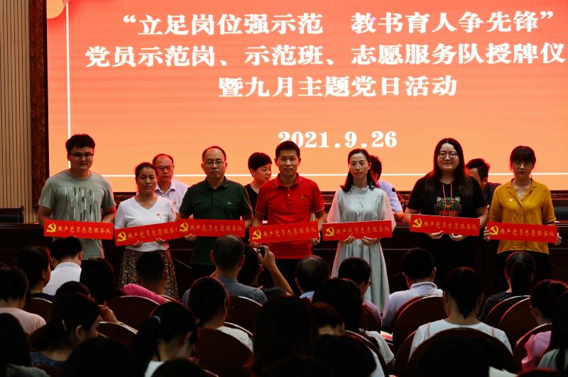 为全面贯彻落实习近平新时代中国特色社会主义思想及党的十九大、十九届四中全会精神,巩固“不忘初心,牢记使命”的主题教育成果,引领广大党员立足本职岗位,发挥党员带头、示范、辐射作用,2021926日,学校党委组织全体党员在学校道德讲堂举行了一年一度的“立足岗位强示范,教书育人争先锋”党员示范岗、示范班、志愿服务队授牌仪式暨九月主题党日活动。