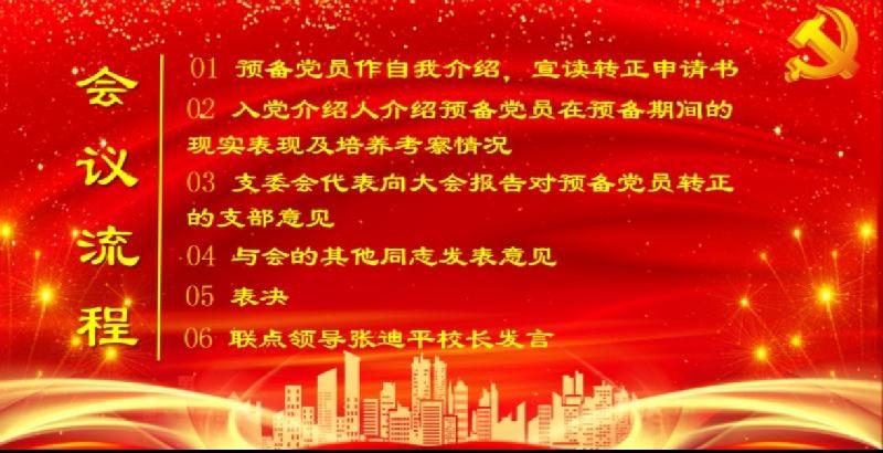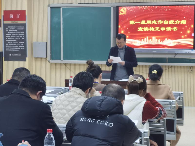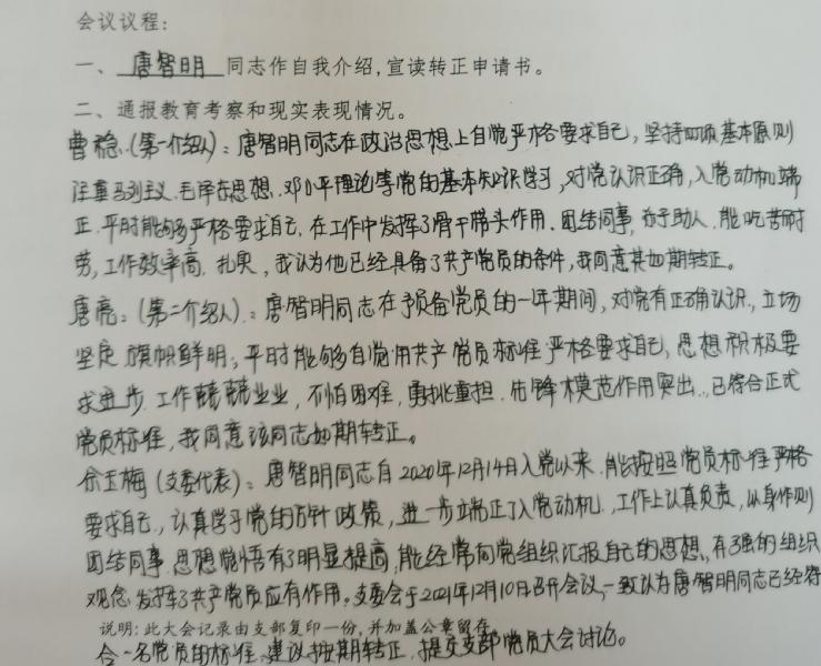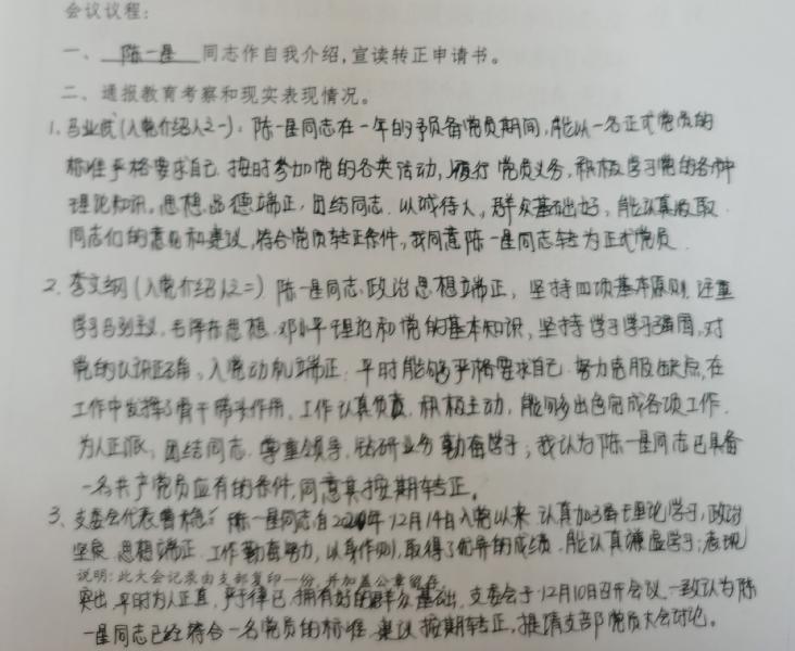 会议严格按照预备党员转正的流程要求进行,在清查人数、通报出席会议的党员情况后,陈一星、唐智明、王武辉等三位同志分别宣读了《转正申请书》,并汇报了自己在预备期间的表现。三位预备党员的入党介绍人马业武李文纲、唐亮、曹稳、彭水珍等同志分别介绍了他们在预备期的表现,并表明同意他按期转正与会党员同志分别对三位同志的转正发表了意见。经无记名投票表决,与会正式党员一致同意陈一星、唐智明、王武辉等同志按期转为中共正式党员。支部书记彭水珍宣读了同意三位同志按期转为中共正式党员的支部决议。王武辉同志为代表作了表态发言。