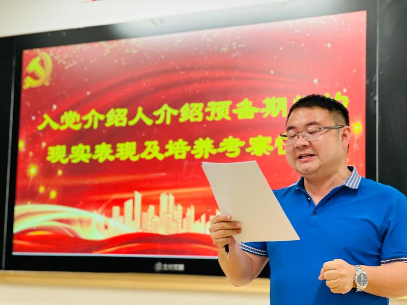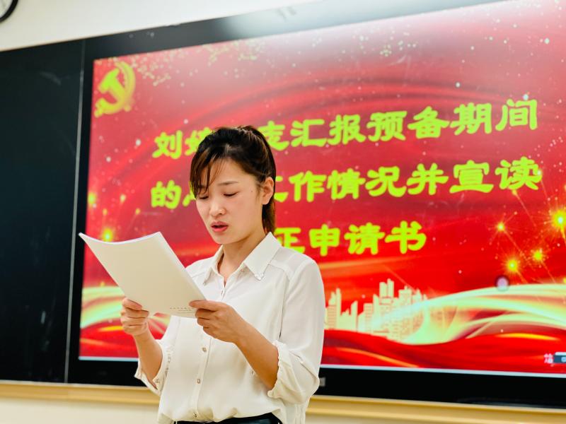 会议严格按照预备党员转正的流程要求进行,在清查人数、通报出席会议的党员情况后,刘婷同志宣读了《转正申请书》,汇报了自己在预备期间的表现。刘婷的入党介绍人方煦、陈爱国介绍了刘婷在预备期的表现,高度肯定了刘婷在预备党员期的优秀表现,并表明同意其按期转正;高三年级组长曹稳代表支委会向大会报告对刘婷同志转正的支部意见;高三语文备课组长周文杰赞扬刘婷身为青年语文教师的专业素养;G1907班班主任刘利评价刘婷在人妻、人母、同事及科任教师等身份角色中都表现优异;王武辉老师谈到了日常交往中刘婷老师给他带来的诸多感动。经举手表决,与会正式党员一致同意刘婷同志成为中共正式党员。支部书记彭水珍宣读了支部决议。