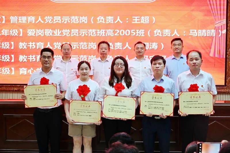 活动在雄壮的国歌升中拉开帷幕,全体党员肃立高歌,颂党恩,庆七一。校长张迪平宣读了2022年“两优一先”等表彰决定,勉励广大党员以受表彰的集体和个人为榜样,为推动学校高质量发展作出新的贡献。党委书记许庆丰,校长张迪平,副校长胡惠、张志为一批优秀共产党员、优秀党务工作者、先进基层党组织、优秀示范岗代表颁发了荣誉证书。九年级党支部涂作颖、宋翔飞、黄文光获得优秀党员称号,九年级党支部教育岗获评优秀示范岗。