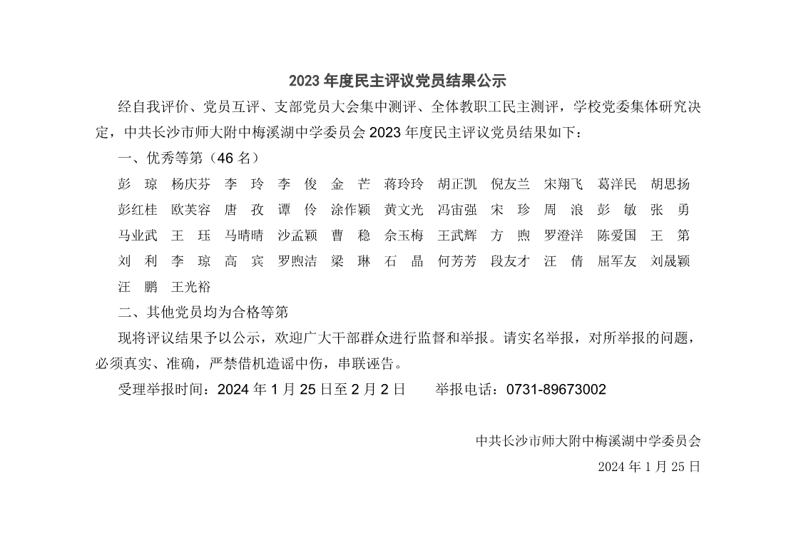 2023年度民主评议党员结果公示