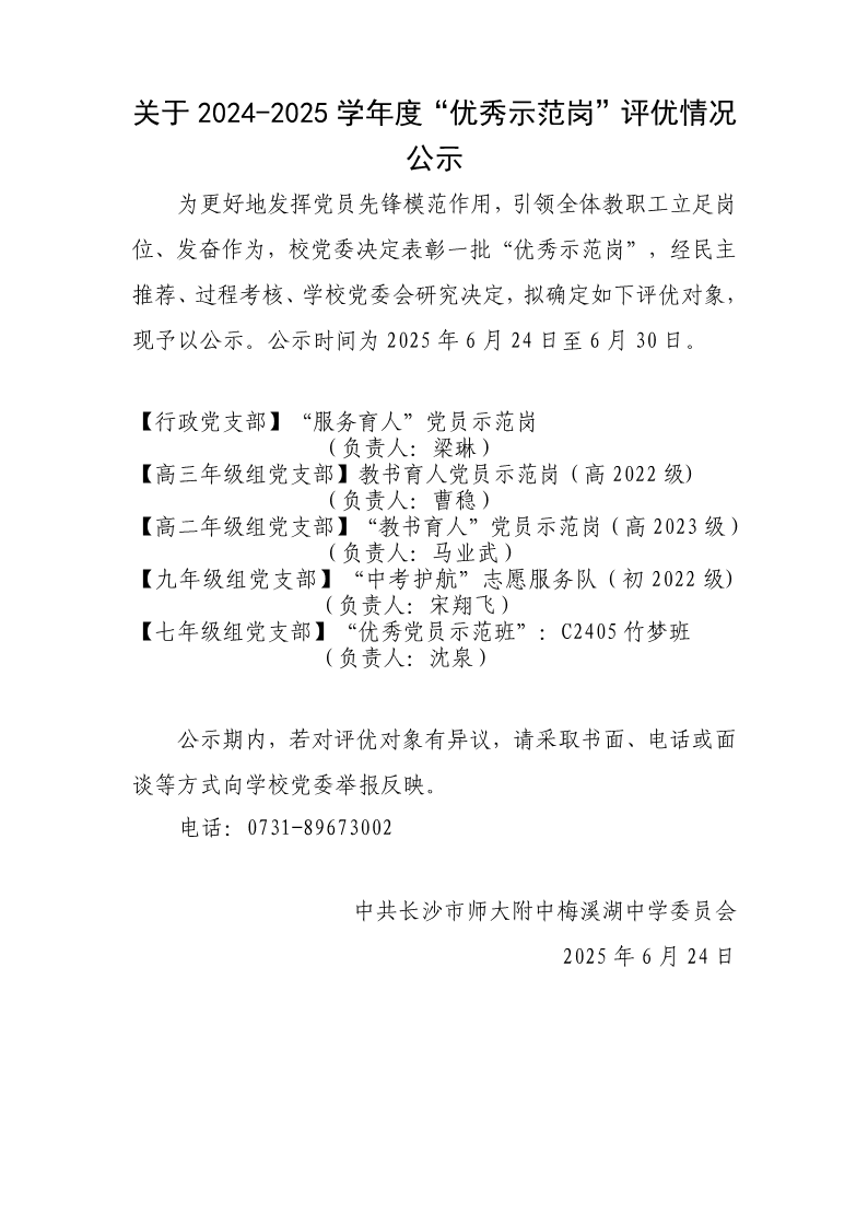 关于2024-2025学年度“优秀示范岗”评优情况公示