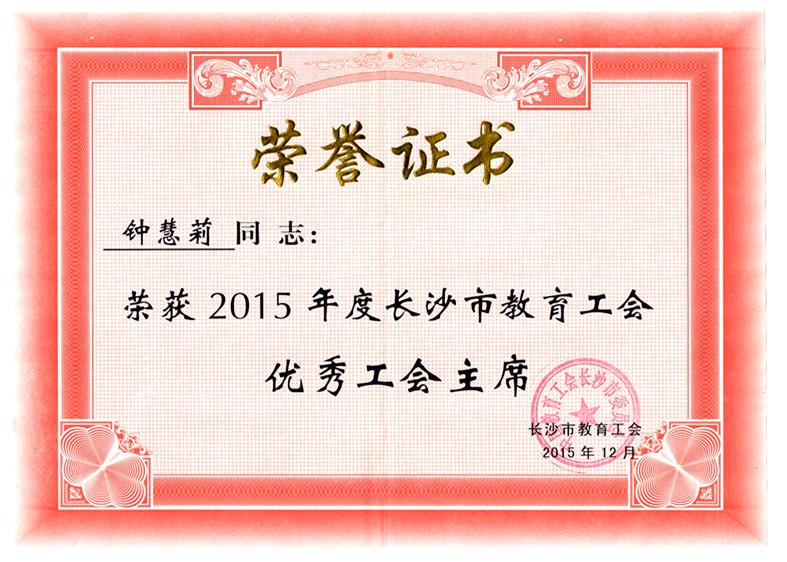 在学校领导的关心和支持下,学校工会工作开展有声有色。在2015年度长沙市教育工会工作考核评比中,我校获得“先进单位”荣誉称号。钟慧莉书记荣获2015年度长沙市教育工会“优秀工会主席”。特此向全体师生报喜!