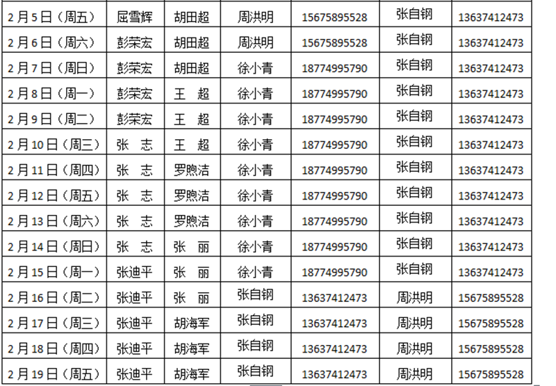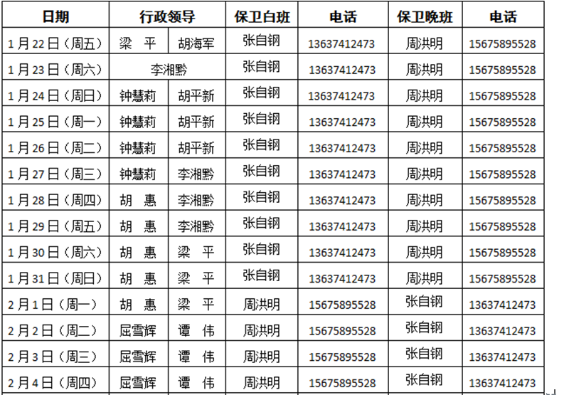 放假期间,请各部门妥善安排好值班和安全、保卫等工作,注意防火、防盗,防止事故发生,确保校园安全和师生生命财产安全,寒假值班安排如下: