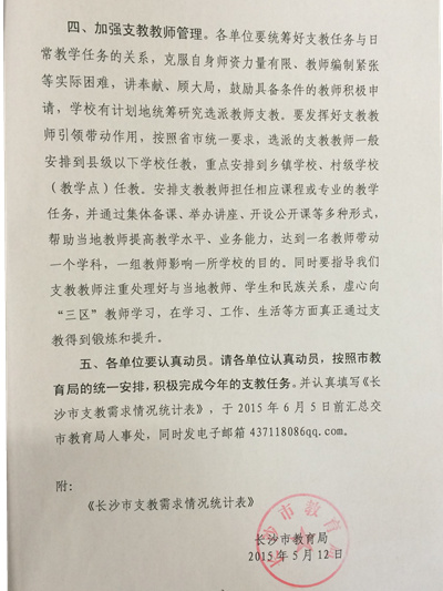 2016-2017年长沙市直属单位“三区”支教工作现已启动,我校拟派一名老师参加本次支教工作。请有意愿的在岗在编老师到校办现场报名或者电话报名(校办联系方式:0731-89678808),报名时间为2016年5月19日至5月25日。有关信息请参照以下“关于做好2015年市直单位教师支教工作的通知”。