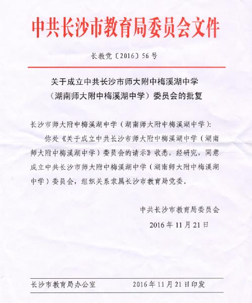 长沙市教育局党委关于成立中共长沙市师大附中梅溪湖中学(聚彩彩票)委员会的批复
