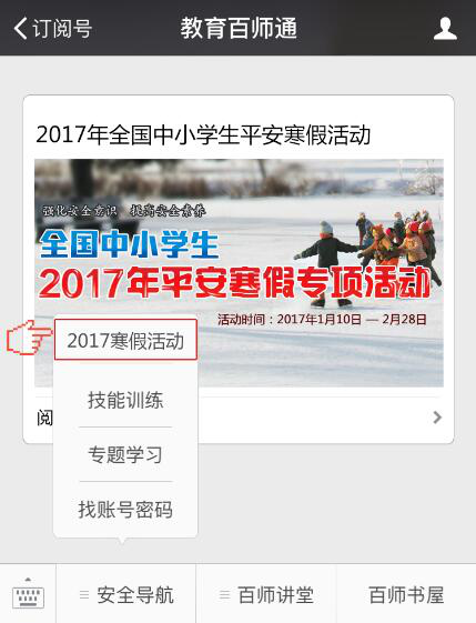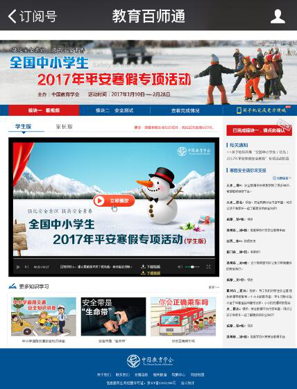 您好!寒假将至,中小学生(幼儿)安全事故进入高发期,为了提高家长和学生的安全意识和防范能力,请家长和孩子用账号登录长沙市学校安全教育平台,参加“2017年平安寒假安全教育专项活动”,同时希望家长加强对孩子假期的安全教育和监管,确保孩子度过欢乐平安祥和的假期。此次活动参与方式如下: