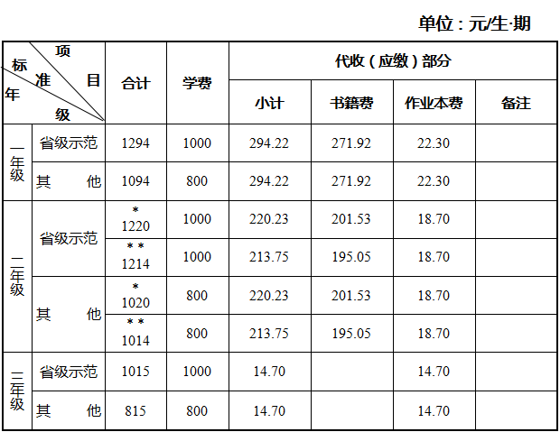 (5)原择校生择校费标准统一规范为:省级示范性高中每生每期不超过2300元,市级示范性高中每生每期不超过1800元。择校费不准跨学期预收。向择校生收取择校费后,可按规定收取代收费,但不得再收取学费。