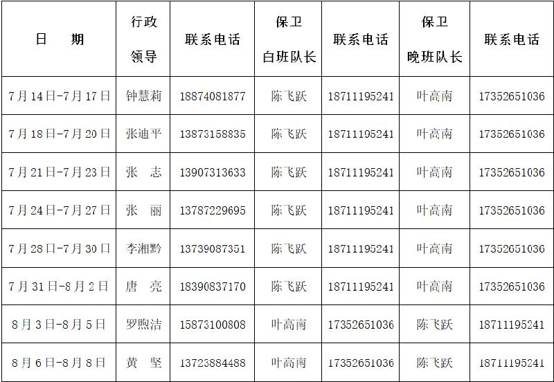 2018年暑期行政值班安排 来源:校办 发布时间:2018-07-09 17:30:27 浏览次数: 次 【字体:小 大】 2018年暑期行政值班安排 值班要求: 1.值班时间:上午八点至下午六点。 2.全天保持手机畅通,有人来校检查请立即向书记或者校长汇报。 3.熟悉文明创建迎国检工作实地考察的内容。 4.每天要有值班巡查情况记录,有问题请及时反馈至微信群。 门卫值班室电话:正门 89673019 东门89673021 负责人:李定根经理134******9359 分享到: 【打印正文】