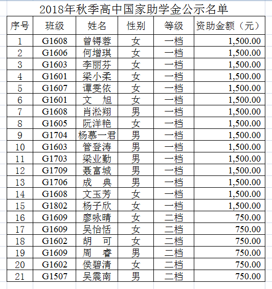 2018年秋季学期普高助学名单公示