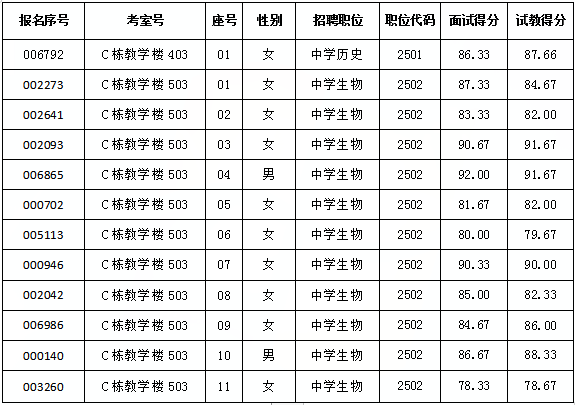 面试、试教成绩的公告 来源:校办 发布时间:2020-07-23 18:22:13 浏览次数: 次 【字体:小 大】 各位考生: 我校中学历史(2501)、中学生物(2502)职位的面试、试教工作已经完成,现将参加面试、试教考生的成绩(见下表)予以公布。 长沙市师大附中梅溪湖中学 2020年7月23日 分享到: 【打印正文】