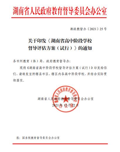关于印发《湖南省高中阶段学校 督导评估方案(试行)》的通知 来源:校办 发布时间:2022-01-10 10:30:40 浏览次数: 次 【字体:小 大】 湘政教督办 2021 25号 关于印发《湖南省高中阶段学校督导评估方案(试行)》的通知 附方案.pdf 分享到: 【打印正文】