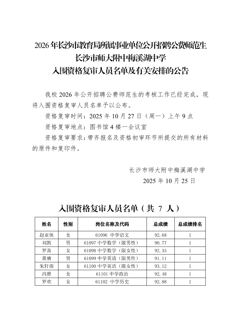 长沙市师大附中梅溪湖中学2026年公开招聘公费师范生入围资格复审人员名单及有关安排的公告 来源: 发布时间:2025-10-25 14:09:14 浏览次数: 次 【字体:小 大】 终审:聚彩彩票 分享到: 【打印正文】