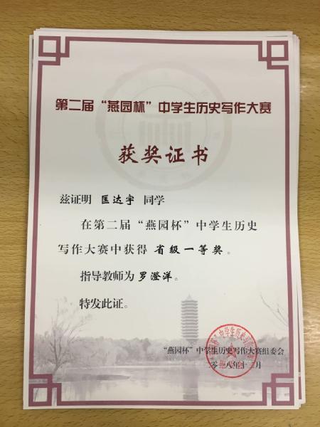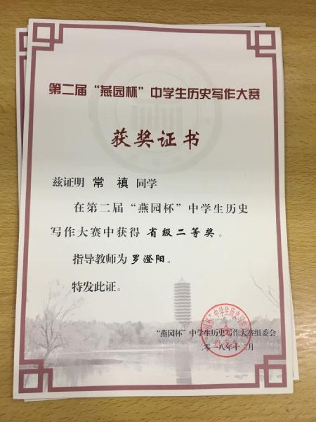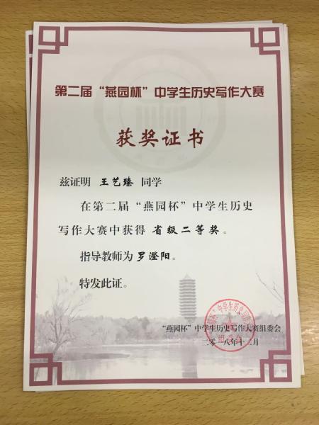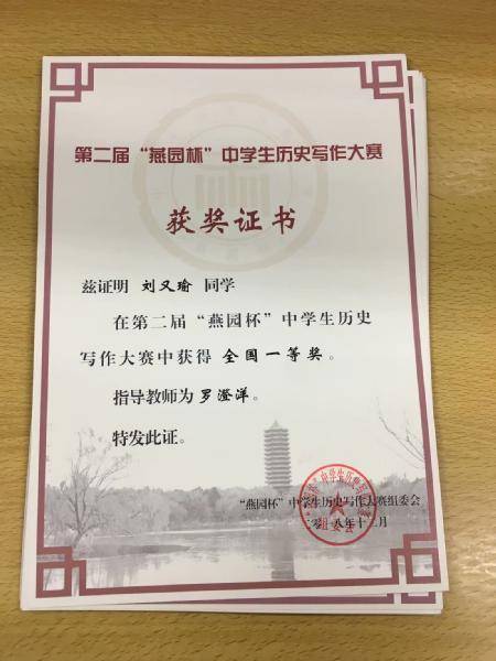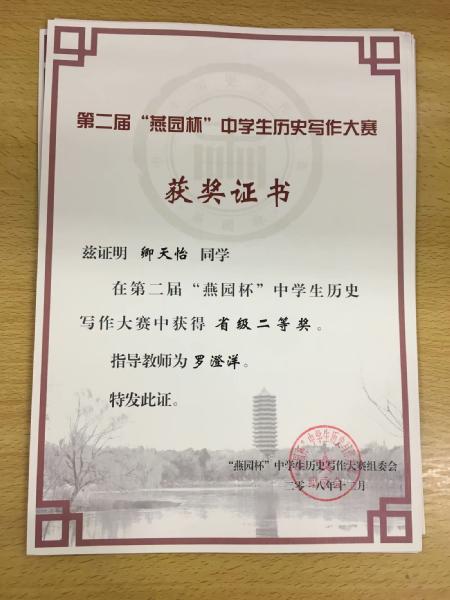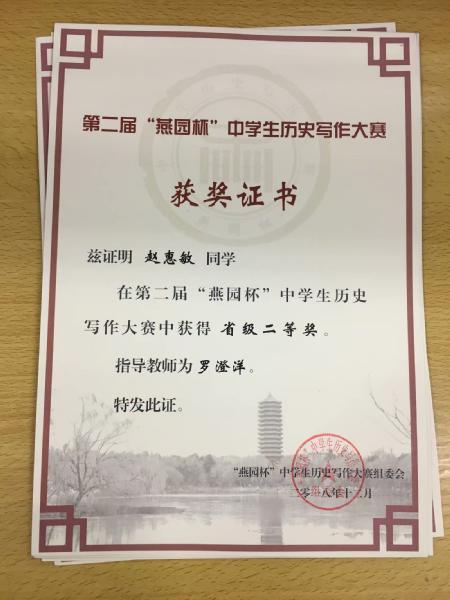 喜报:我校学子在第二届“燕园杯”全国中学生历史写作比赛中获得佳绩