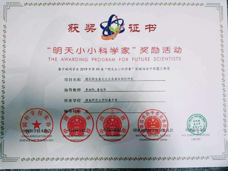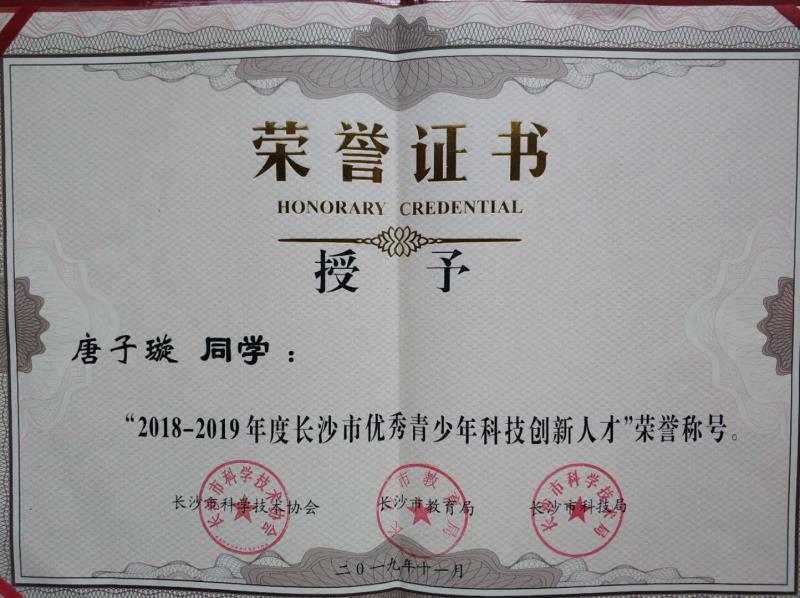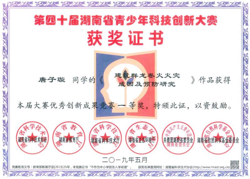 我校唐子璇同学荣获湖南省青少年科技创新大赛一等奖