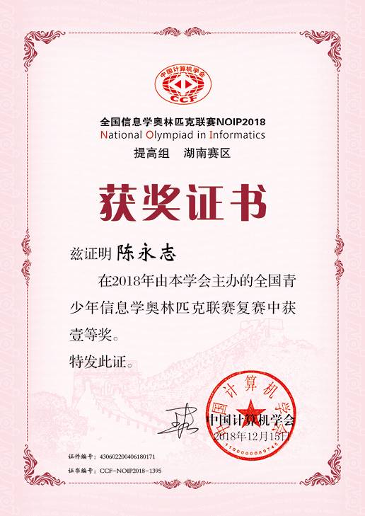 2018年全国青少年信息学奥林匹克联赛中,我校参赛选手在李稀、李慧敏两位教练的精心指导下,顽强拼搏,喜获佳绩!C1611陈永志同学荣获提高组一等奖;C1602姬周、C1605周凯、C1611祝嘉诺三位同学荣获提高组二等奖;C1711胡畅宇同学荣获普及组一等奖;C1605周凯、C1604刘星桐、C1607郭森浩、C1711刘天卓、C1704刘珏驿等5位同学荣获普及组二等奖;C1711邓钰凯同学荣获普及组三等奖。