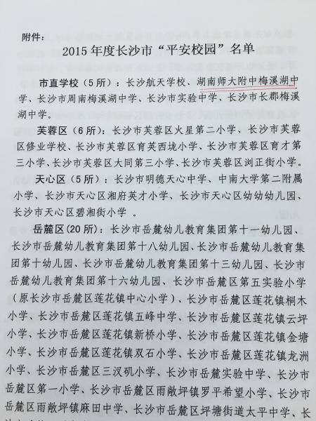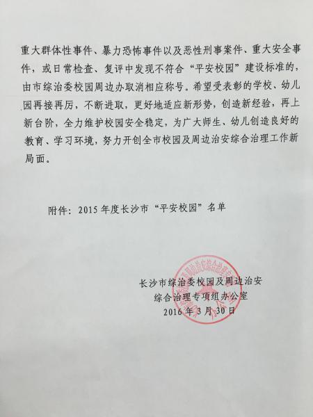喜报:我校荣获2015年度长沙市“平安校园”和“安全文明校园”称号