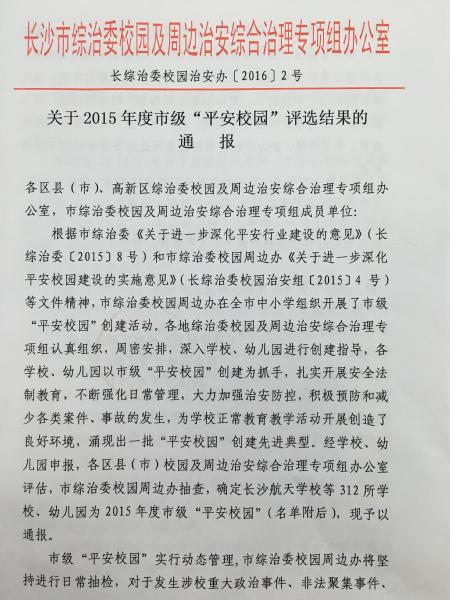近日,喜讯传来,根据长沙市综治委《关于2015年度市级“平安校园”评选结果的通报》和《关于2015年度市级“安全文明校园”评审结果的通报》,我校荣获2015年度长沙市“平安校园”和“安全文明校园”的称号,特此向全体师生报喜!