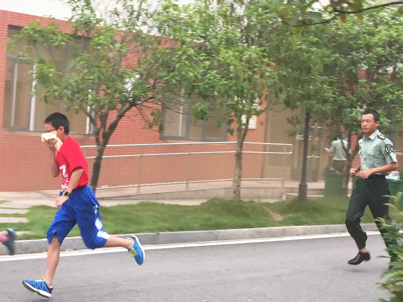6:50消防警报拉响,全体同学在教官黄灿的总指挥下,“掩住口鼻、弯腰前行、有序小跑”,快速地从宿舍楼规定疏散路线撤离至田径场集合。随后,各班带队教官立即清点人数并向总指挥报告,全体参演学生均安全成功撤离,全程用时不到五分钟。此次演习过程井然有序,没有出现拥挤、推搡、不礼让的现象。