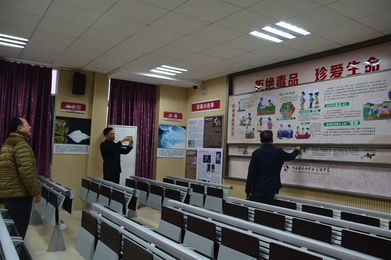 12月4日,长沙市禁毒办副主任、市禁毒支队副支队长欧建平,长沙市禁毒支队罗坚站长,长沙市教育局安全处胡光林到我校,检查验收市级毒品预防教育示范学校创建工作。副校长胡惠、保卫处主任兼校办副主任胡海军全程陪同检查。