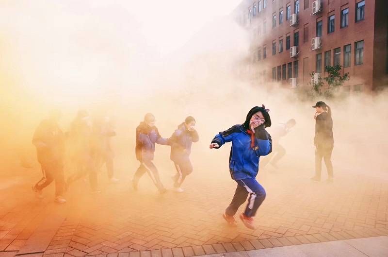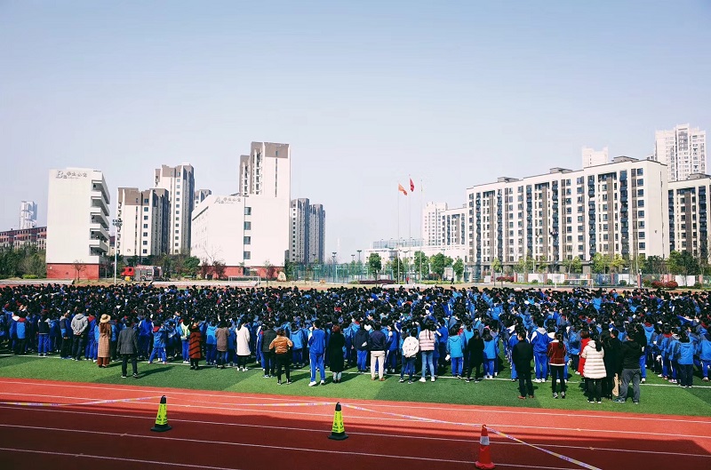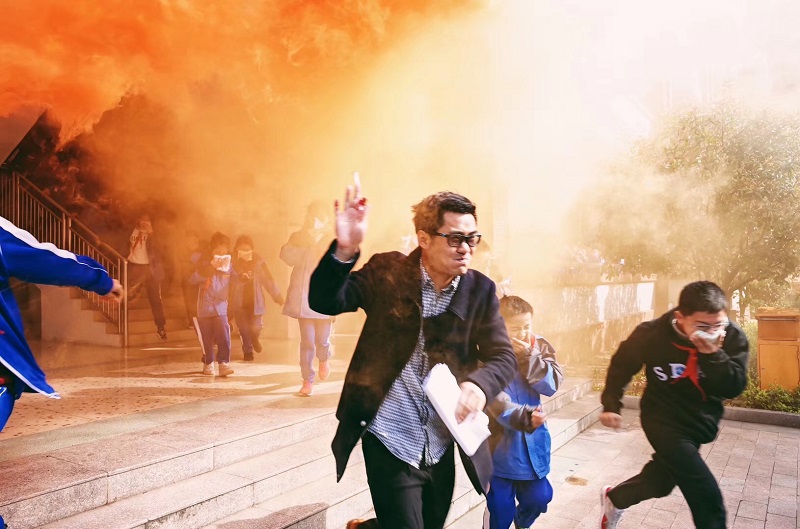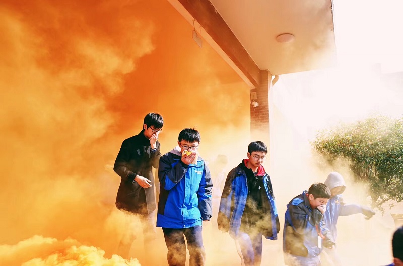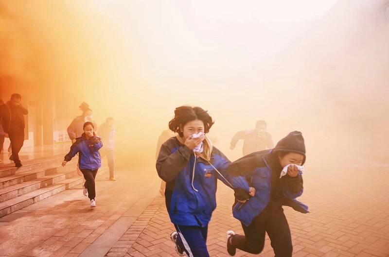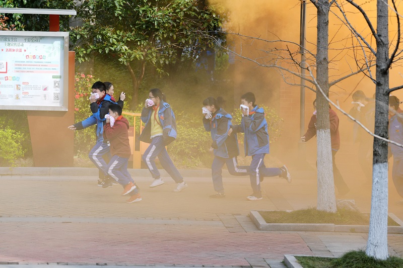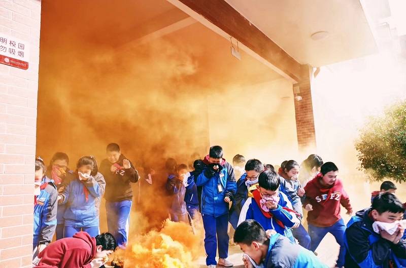 上午9点30分,学工处主任胡田超发出演练开始通知。警报声在校园顿时响起,各栋教学楼烟雾四起。年级组长、班主任与任课老师立即组织学生按照疏散路线撤离。老师们带领学生弯着腰、猫着步,用湿毛巾、衣襟等捂住口鼻,沿着学校指定的疏散路线很快疏散至集合地点。随即各班清点人数,并层层向上汇报。短短的5分多钟,全校3000多名师生全部有序、快速、安全地撤离到学校操场并整齐列队,达到了消防应急疏散演练预期目的。