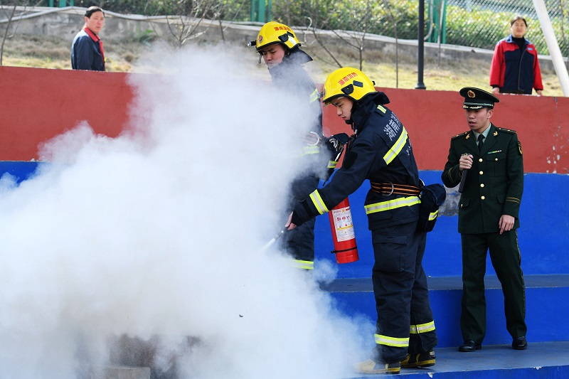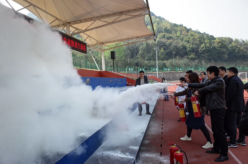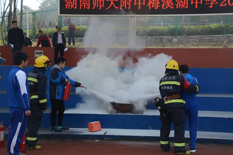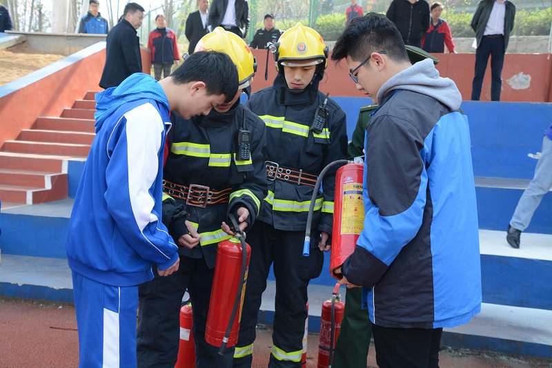 集合完毕后,保卫处主任兼校办副主任胡海军主持了消防救援演练和消防救援培训。全体师生一同观看了消防队利用消防车、水枪灭火的实战演习。随后,消防队谢教官带领官兵讲解了预防火灾的相关知识, 点燃了事先准备好的可燃物,并现场演示了干粉灭火器的正确使用方法。在消防官兵的指导下,各班安全委员、学生代表及老师们提着灭火器灭火,真实的模拟了火灾现场,亲身体验了灭火过程。