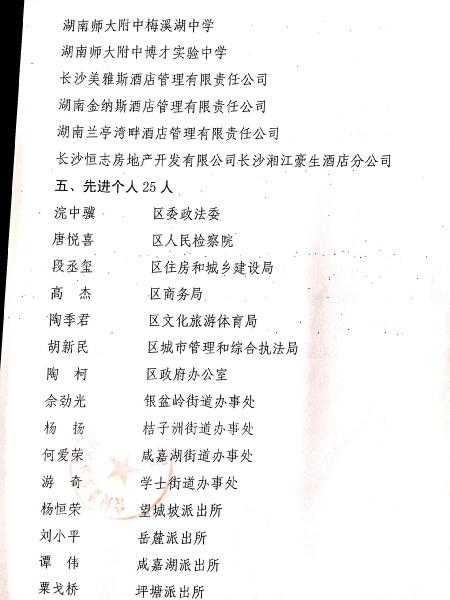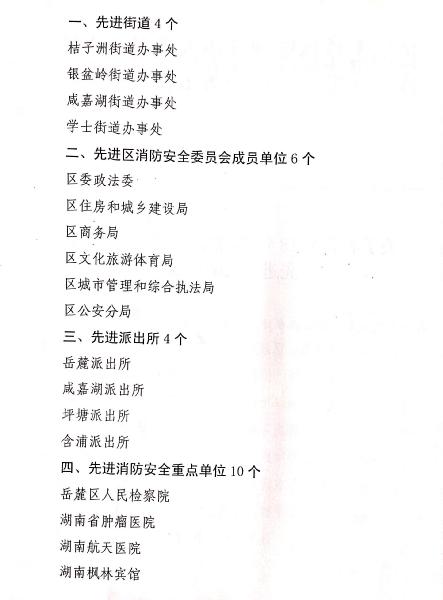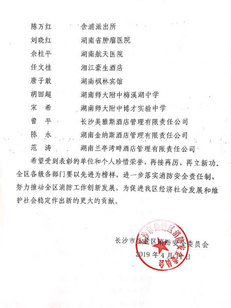 喜报:学校获评2018年度岳麓区消防工作先进单位 来源:校办 发布时间:2019-04-16 09:42:03 浏览次数: 次 【字体:小 大】 根据长沙市岳麓区消防安全委员会下发的《关于表彰2018年度消防工作先进单位和先进个人的通报》知悉,我校被评为2018年度岳麓区消防工作先进单位,保卫处主任兼外事办主任胡田超被评为2018年度岳麓区消防工作先进个人。 分享到: 【打印正文】