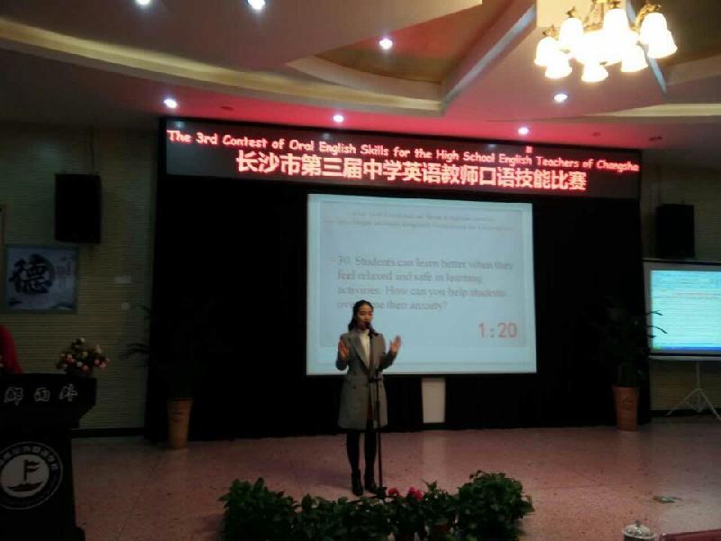 12月9日,长沙市第三届中学英语教师英语口语技能大赛在长沙举行。我校英语组教师王珏凭借沉稳大气而优雅出彩的表现荣获特等奖,并直接晋级CCTV全国希望之星教师风采大赛。