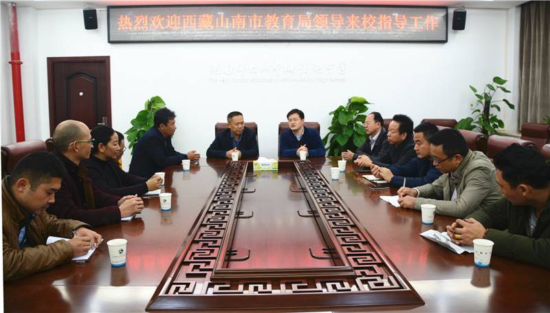 11月14日下午,西藏山南市教育局副局长钟秋明、第三高级中学党委书记普布次仁等一行来我校看望四位挂职培训的老师。我校校长彭荣宏,副校长胡惠、张迪平、张志,教务处主任梁平热情接待了客人们。