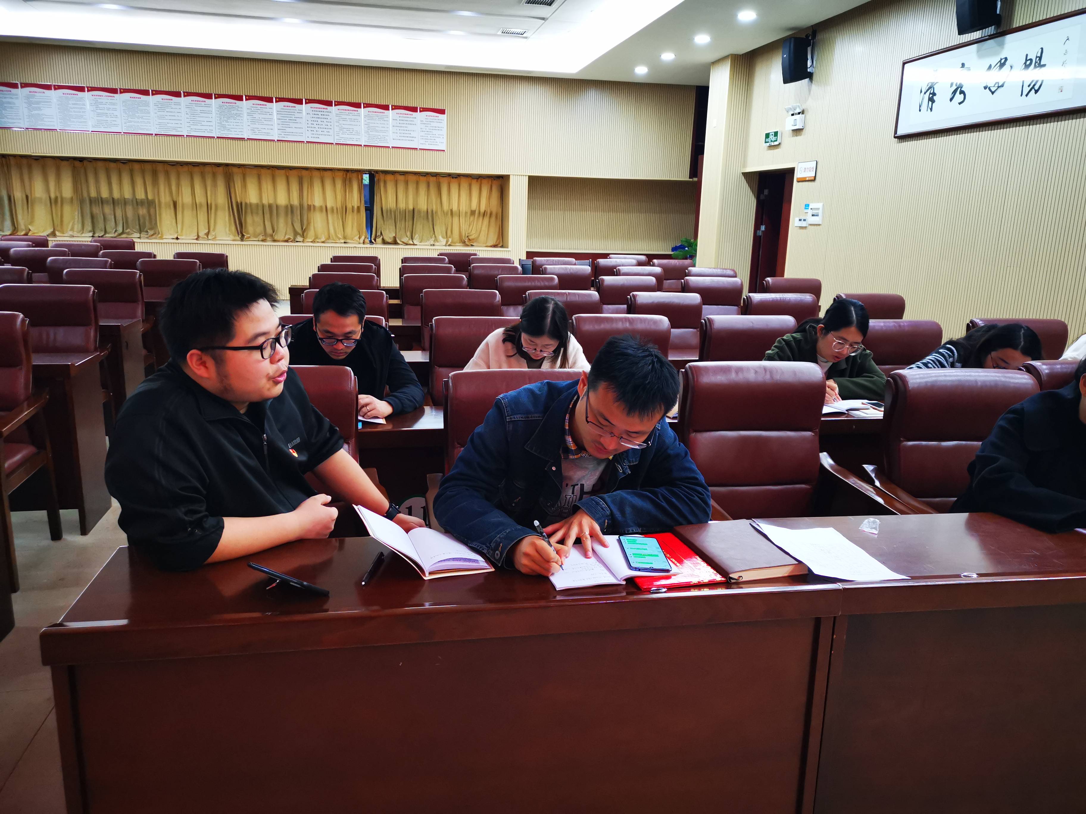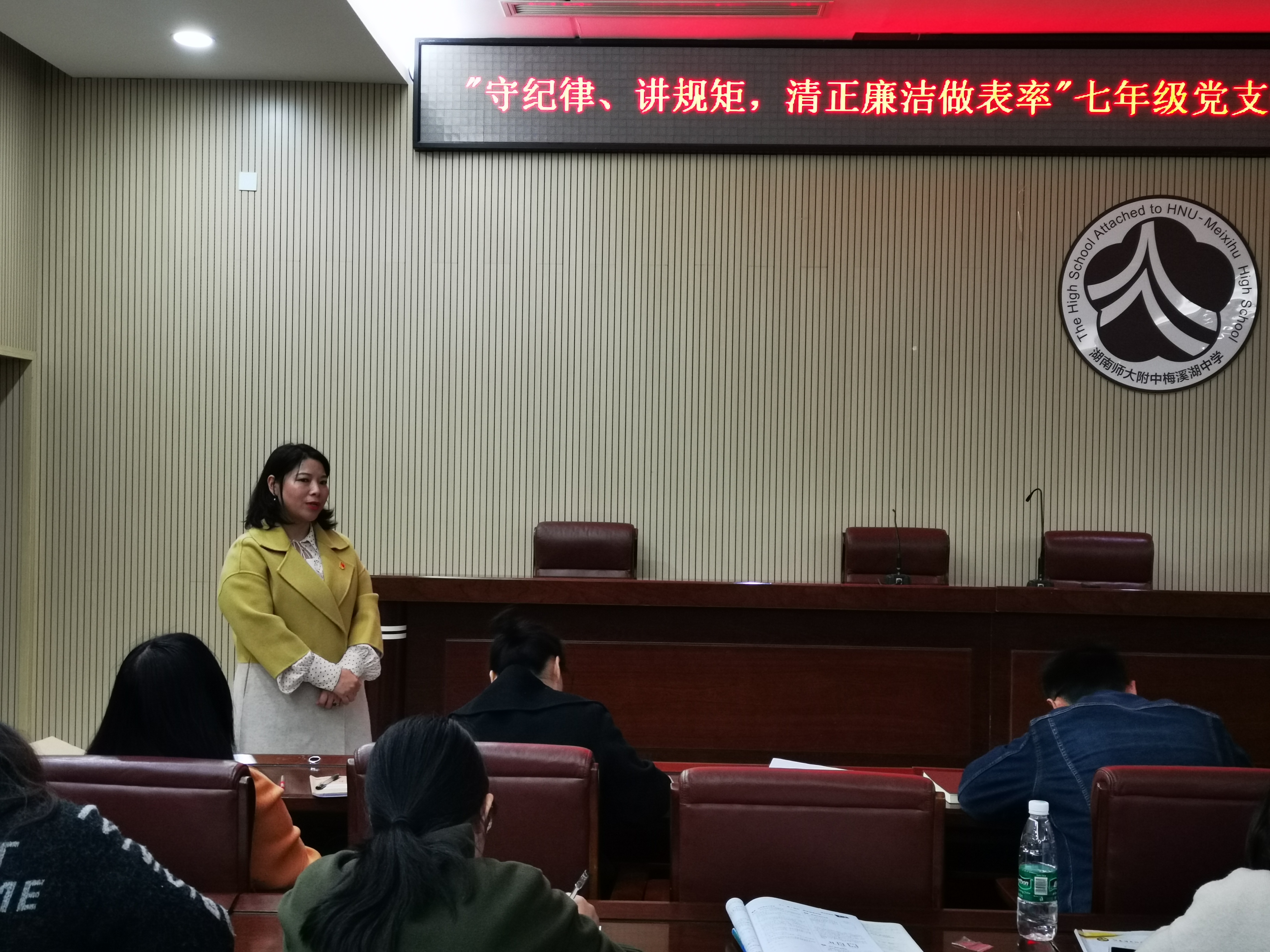 10月17日下午,师大附中梅溪湖中学七年级党支部组织全体党员教师在图书馆一楼三会议室举行以“守纪律、讲规矩,清正廉洁做表率”为主题的集中学习研讨交流会,七年级党支部全体党员教师参加,会议由七年级支部书记葛洋民同志主持,校党委办公室副主任谢桢豪同志到会指导。