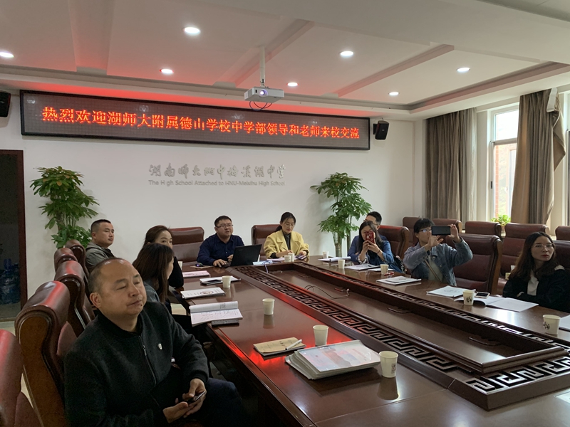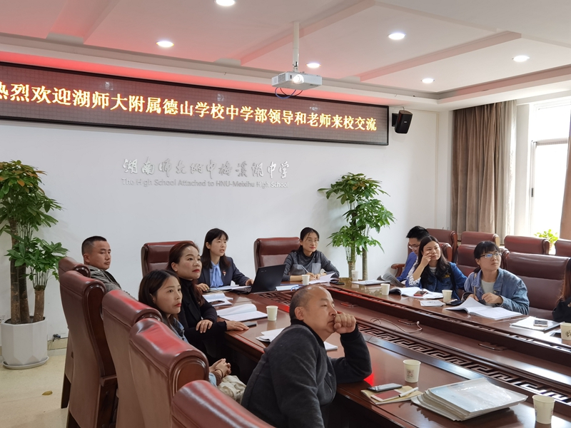 10月30日,湖师大附属德山学校中学部党总支书记樊希国、中学部校长林松茂一行14人来校交流。我校校长张迪平,副校长陈益热情地接待了客人们。