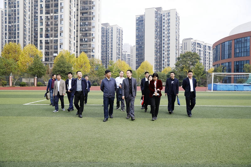 在学校领导的陪同下,客人们深入实地进行考察,参观了教室、教师办公室、STEM功能室、体艺馆、食堂、田径场等处。参观过程中,张迪平介绍了我校基本情况和办学成效,重点就学校规划、建设、管理等方面与客人们进行了深入交流。