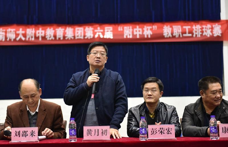 黄月初致开幕词,他代表附中党委,向为筹备本次赛事付出辛勤劳动的组委会、各集团校工会、教职工运动员们等表示了衷心感谢。他指出,开展群众性体育竞赛活动,是落实《全民健身计划纲要》,引导教职工养成积极锻炼、健康生活的重要措施,也是营造团结、和谐、积极进取的校园文化氛围,培育团队精神、集体主义精神、竞争意识的重要措施。他希望通过组织开展教职工排球赛,进一步推动附中教育集团群众性体育运动蓬勃发展,为教职工创造更多的锻炼机会,为创建幸福校园做出更大贡献。