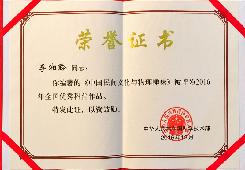 李湘黔的著作《中国民间文化与物理趣味》屡次获国家大奖,分别为:国家新闻出版广电总局全国农家书屋重点出版推荐目录、中宣部共青团教育部向全国青少年推荐百种优秀图书、全国少工委中华传统文化新书单、国家新闻出版广电总局东方工程图书(翻译成锡伯文等)。此次湖南省获科技部全国优秀科普作品还有湖南省人民医院院长祝益民主编的《第一目击者—现场急救指南》。《中国民间文化与物理趣味》一书将物理学和中华传统民间文化巧妙地结合起来,在小故事中彰显民间文化的大智慧,在生产生活现象解读中呈现物理学的基本知识和方法,在传承中华传统文化过程中拓展读者的多维思想空间。作为普及读物,融生活味、人文味、人情味、文学味为一体,体现了科学与文学、艺术和人文的有机结合。