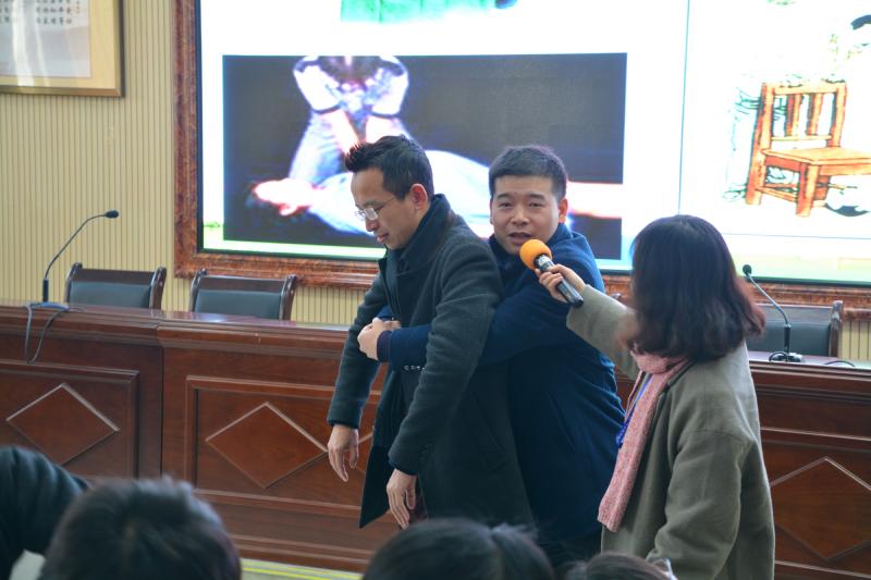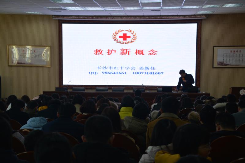 其次,长沙红十字会救护培训处负责人姜新任给老师们上了一堂精彩的“应急救护知识”培训课,阐述了急救黄金46分钟的重要性并现场示范心肺复苏的各个操作流程,“人人学急救,急救为人人”。