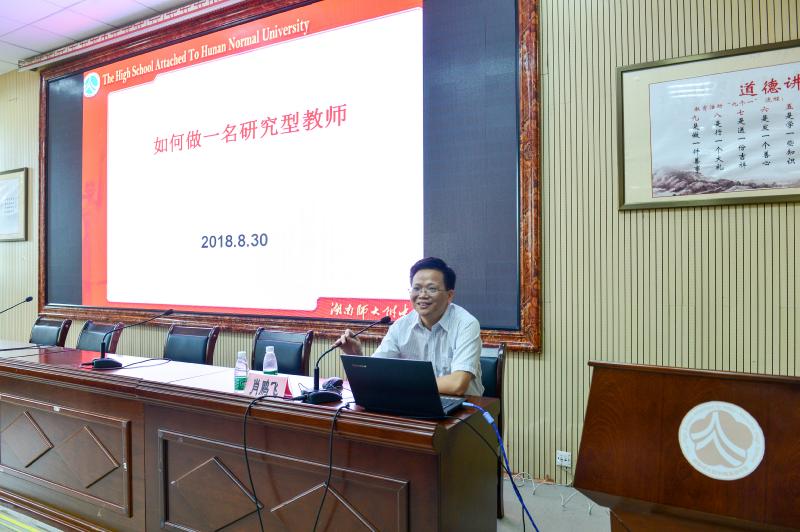 8月30日上午的培训由副校长张迪平主持。长沙市师德标兵、广益中学学工处副主任兼年级组长曾丽南作了“年级管理,走心为上”的主题讲座,从年轻师资培育、学生素养提升、家校和谐共建三个方面用一个个具体案例讲述了有心、用心才能建设一个优秀的年级组,才能使家校和谐发展的道理。没有爱的教育不是好教育,没有行动力的教育是空想教育。随后,由享受国务院政府特殊津贴专家、正高级教师肖鹏飞作了“如何做一名研究型教师”的主题培训。他建议大家扩大视野,跳出教育看教育,跳出课程看课程,跳出当下看当下,跳出东方看东方。强调要不断学习学科专业知识,学习课标、教材编排体系,学习教育理论、教育理念,学习怎样备课、上课与写教学反思,不断研究学考、高考。他希望老师们在实践中加强研究,做一名研究型教师。