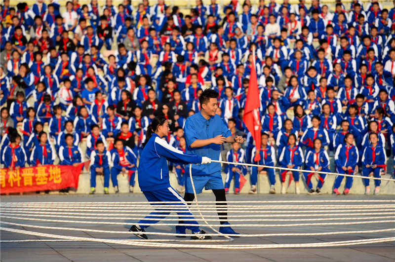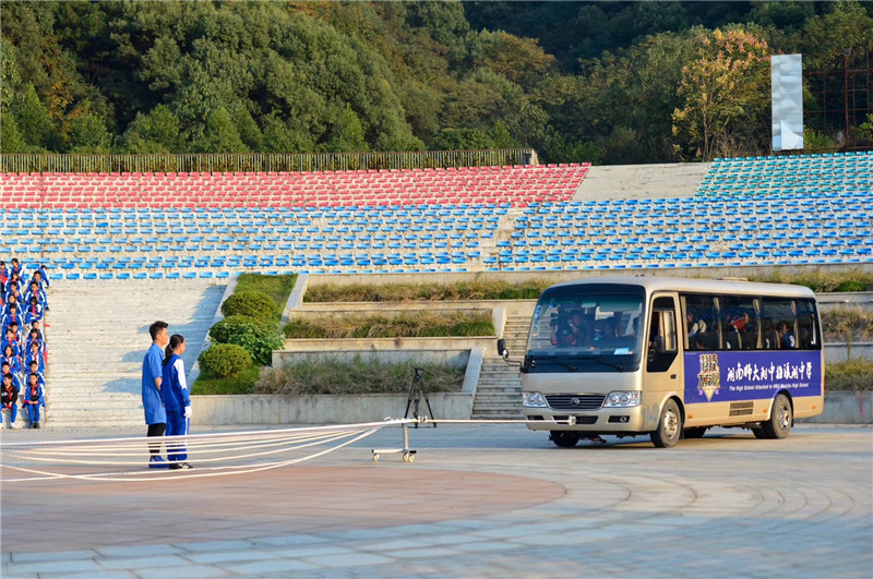 拍摄过程中,我校一女生利用小小身体和滑轮组装置轻松地拉动了满载40位学生的重达7吨的旅游巴士。湖南省STEM科普基地负责人、我校教科室主任李湘黔向大家讲述了滑轮组装置运行原理,并普及了相关知识。拍摄现场,当车轮滚动的那一刻,全场沸腾,惊呼声不绝于耳!