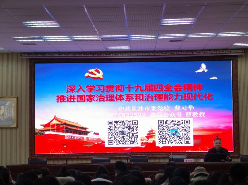 首先中共长沙市委党校副教授曹习华进行了题为“学习党的十九届四中全会精神“的讲座,他从“认识重大意义,把握重大优势,落实重大部署”三方面展开讲述。讲座中,曹习华分析了当今世界主要国家的政治局势,肯定了我国所取得的重大成就,鼓励老师要有制度自信。同时,为了在把握目前优势的基础上进一步落实重大部署,推进国家治理体系和治理能力的现代化,曹习华给在座教师提出希望,即教师要具备相应的工作能力、工作意愿,要遵守相应的工作纪律。曹习华的讲座融合了知趣、理趣、志趣,利于在座教师更立体、深入地了解和贯彻党的十九届四中全会精神。