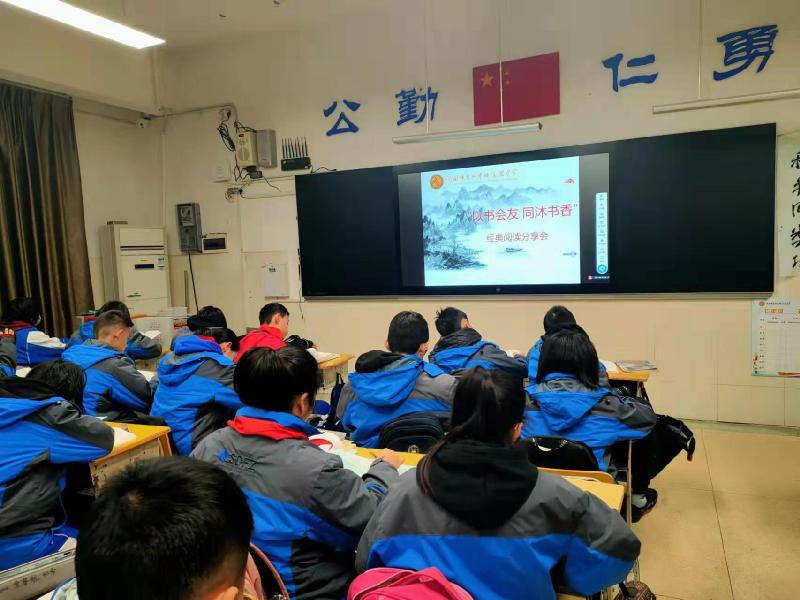 在学校语文组的全力配合下,提前布置阅读范围,各年级在常规阅读课上进行此次经典阅读分享。分享会上,同学们在诵读中增强语感,感受文言精华;在分享中,夯实文化底蕴,铸造完美的人格;在与经典、名著的对话中,感悟、品味、积累,培养其开朗豁达的性情、自信自强的人格、和善诚信的品质。