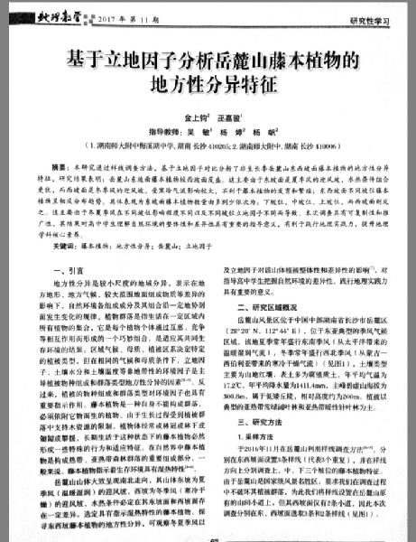 6月,我校高1509班巫嘉骏同学和湖南师大附中的金上钧同学撰写的论文《探究岳麓山藤本植物是否存在空间分异差异》在国家级刊物《地理教学》上发表,论文由我校地理教师吴敏指导。