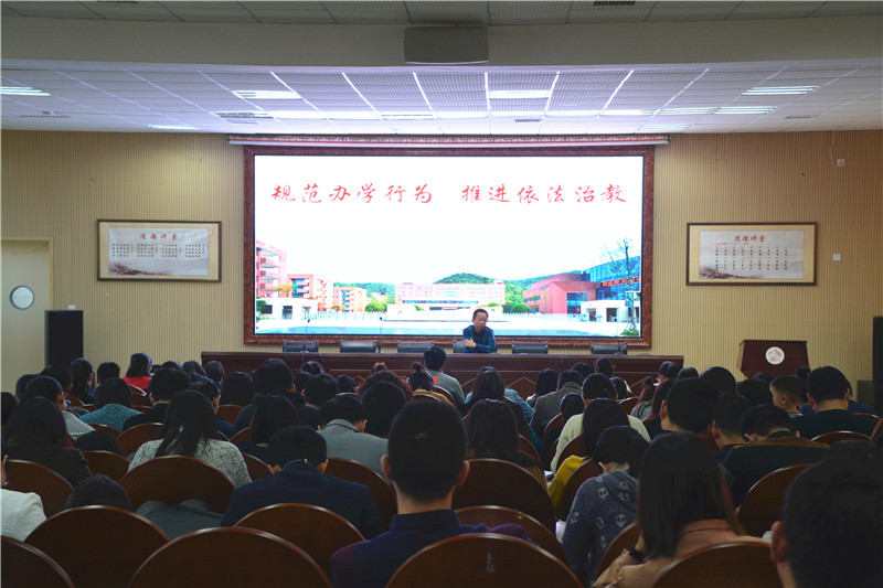 11月2日,我校在道德讲堂围绕“规范办学行为,推进依法治教”主题召开了全体教职工大会,会议由副校长张迪平主讲,党委书记钟慧莉主持。