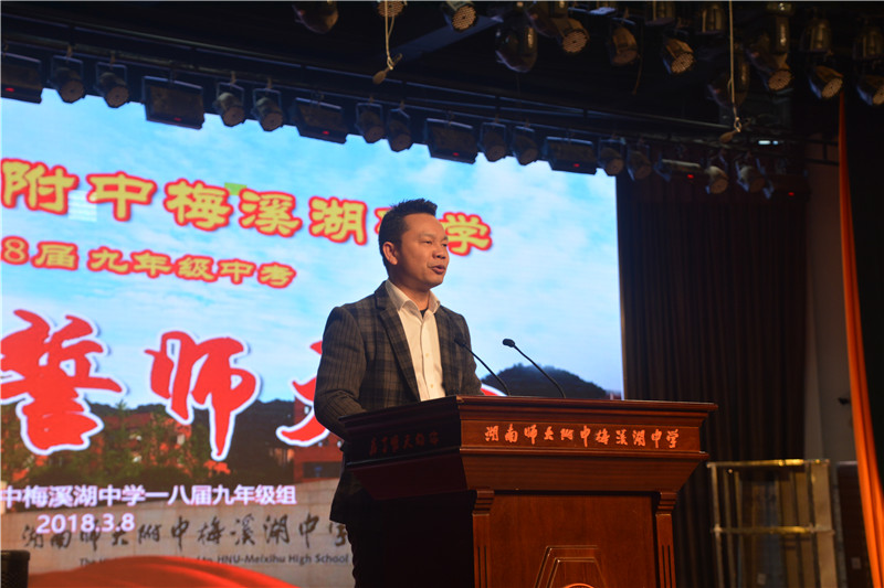大会在庄严的国歌声中拉开了序幕。首先,晏荣贵致辞。他对奋战在一线的九年级全体教职员工表示诚挚的敬意和感谢,对奋斗的九年级学子表达亲切的问候和美好的祝愿。他勉励九年级学子努力拼搏,顺利跨过中考这道坎。他谆谆嘱咐百日冲刺需多做习题,中考不过手熟而已。他也预祝师梅2018年中考再创新的辉煌!